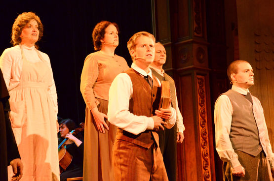 Troupe de la Vallée des possibles sur la scène du Monument Lefebvre. Une image du collège Saint-Joseph est derrière aux.